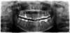 1 implant cylindrique avec sa vis de cicatrisation en bas à gauche, remplaçant les racines de la 2ème prémolaire gauche, en cours de traitement multi-bagues d’orthodontie
